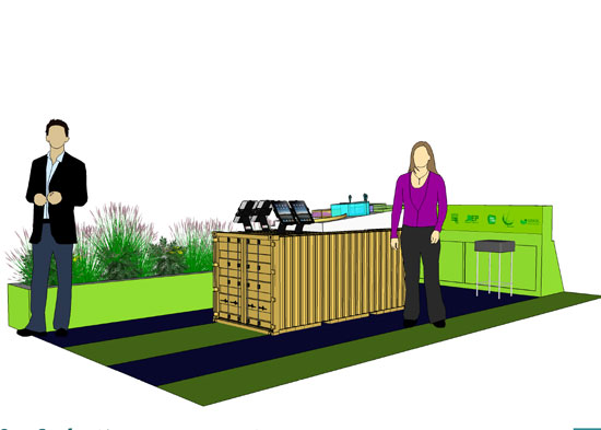 Stand aberto, com uma presença de marca num grande cubo flutuante, Informação disponível através de painel interactivo e de um sistema de Realidade aumentada