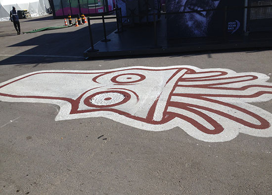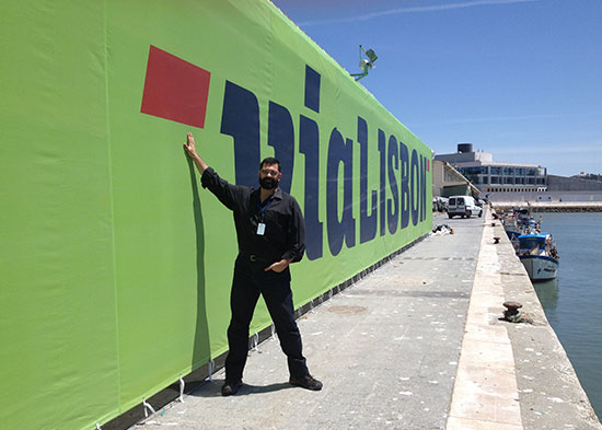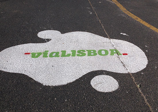 Condução dos visitantes, desde a entrada do recinto até à tenda VIP, com a marca VIA Lisboa grafitada no pavimento